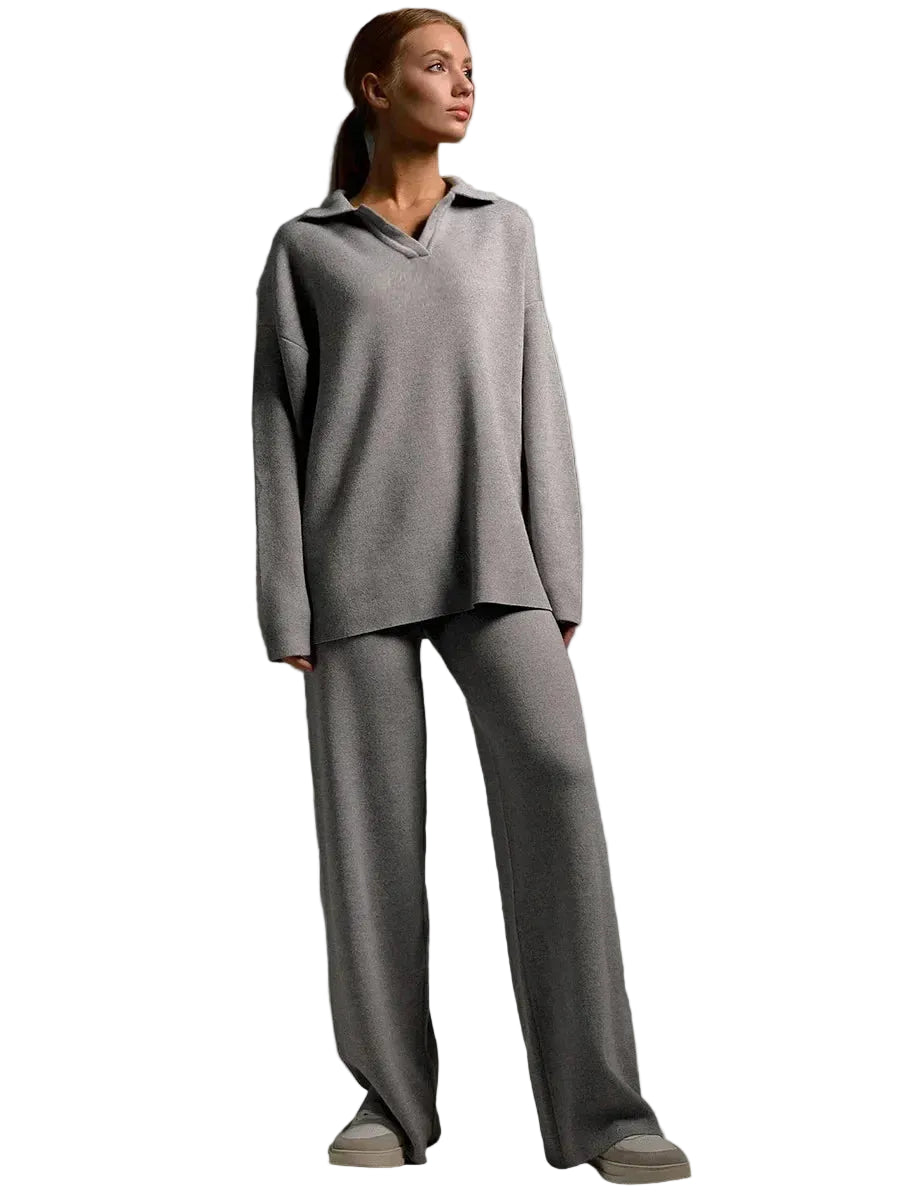 Women’s Collared Knit Lounge Set with Wide-Leg Pants